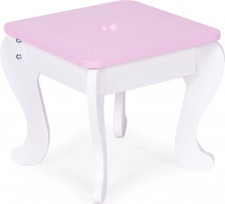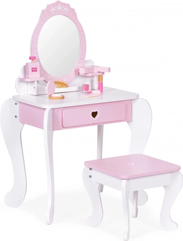 Stolić je izrađen od sigurnog drva i dizajniran tako da potiče razvoj manualnih vještina i mašte vaše djece. Omogućuje i učenje osnova šminkanja. Njegove praktične značajke uključuju izvlačnu ladicu i dvije police koje osiguravaju uredan i organiziran stol.