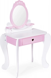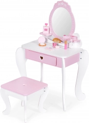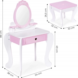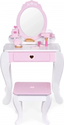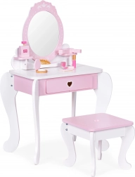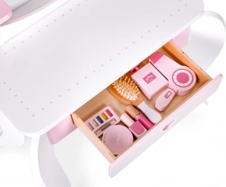 Priredite svom djetetu prostor za kreativnu igru uz veliki dječji toaletni stolić ECOTOYS. Set uključuje stolno ogledalo, široku policu za kozmetiku i stoličicu prilagođenu dječjoj visini. Zahvaljujući dodatnim rekvizitima kao što su igračka sušilo, ruž ili luksuzni parfem, ovaj toaletni stolić pravi je izbor za svaku malu princezu.