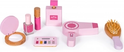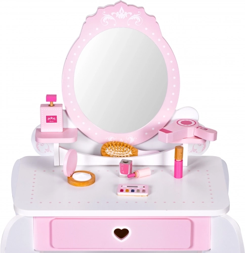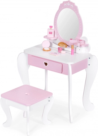Toaletni stolić dolazi s igračkama poput sušila za kosu, četke, pudernice s aplikatorom, palete sjenila, laka za nokte, ruža i bočice parfema. Svi dodaci su bez oštrih rubova, što ih čini u potpunosti sigurnima za djecu.