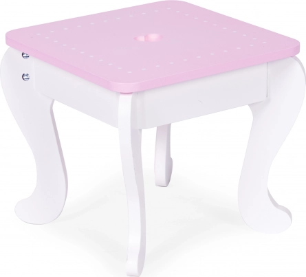 Prilagođena dječjoj visini, stoličica (visina 26,5 cm) pruža udobno sjedenje pri nanošenju šminke. Namještaj je usklađen s toaletnim stolićem kako bi činio stilski set.