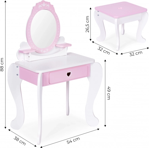 Stolić je opremljen realističnim dodacima i dekorativnim velikim ogledalom te ispunjava san svake male vizažistice. Tijekom igre dijete razvija manualne vještine i maštu te stječe osnovne vještine nanošenja šminke.