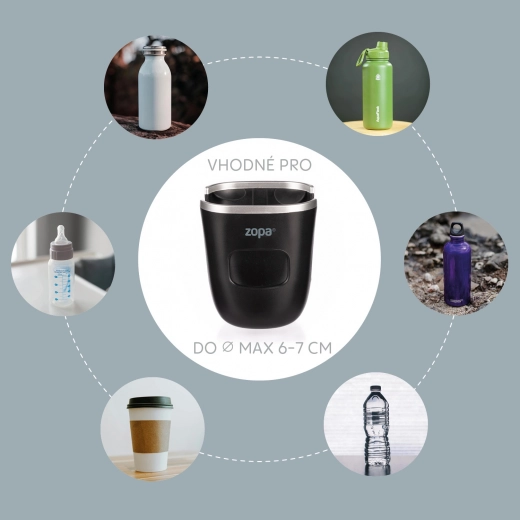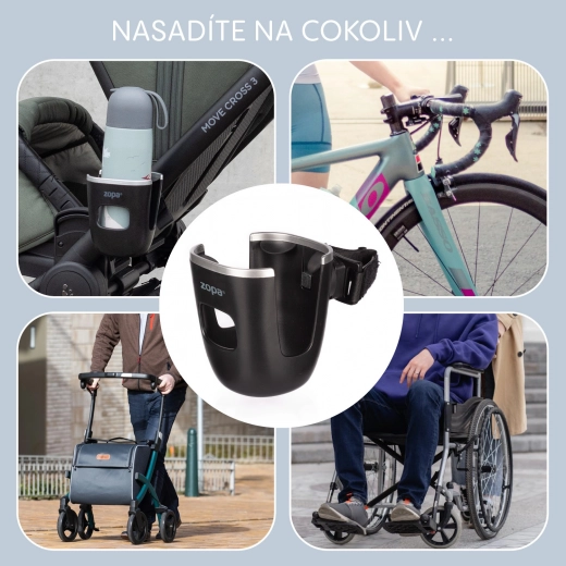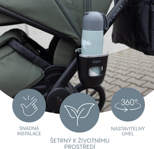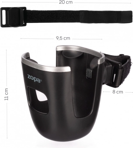 Držač za piće marke Zopa lako se pričvršćuje na kolica pomoću podesive trake. Njegov moderan dizajn sa sjajnim metalnim rubom idealan je dodatak za svakodnevnu upotrebu. Praktičan crni plastični držač osmišljen je tako da sigurno učvrsti bocu ili šalicu na putu.