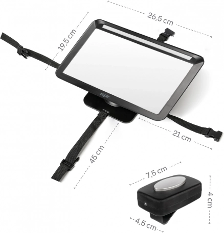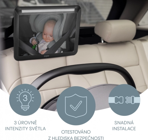 Odlično zrcalce za roditelje koji žele imati sigurnost svoje djece pod kontrolom i tijekom vožnje. Zrcalce je opremljeno s tri razine LED osvjetljenja koje osiguravaju savršen pregled i u mraku. Zahvaljujući jednostavnoj instalaciji pomoću podesivih remena, zrcalce se može čvrsto i sigurno pričvrstiti na naslon za glavu. Izrađeno je od izdržljivih materijala kako bi podnijelo dugotrajnu upotrebu.
