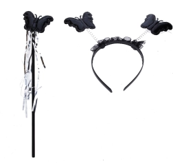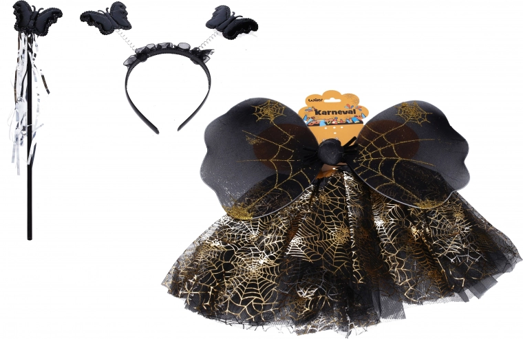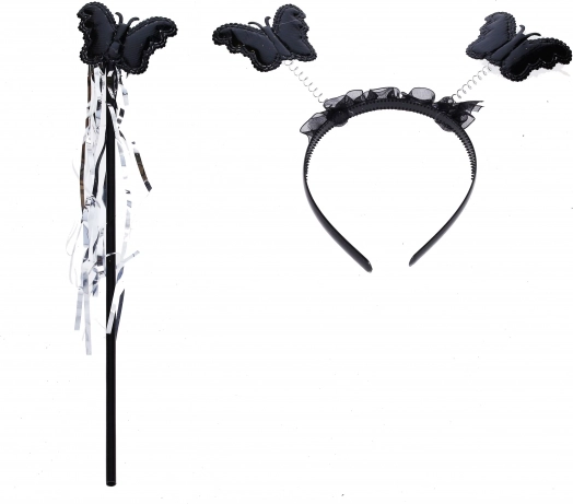Stilizan karnevalni set za male vile i leptiriće u elegantnoj crnoj boji. Sadrži sve potrebno za brzu preobrazbu: krila, suknju (duljina 29 cm), čarobni štapić i obruč. Idealan za karneval, maskenbal i bajkovite kostime.