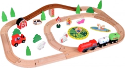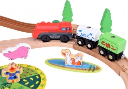 Ova drvena željeznička garnitura idealna je za razvoj dječje mašte i motoričkih vještina. Visoka kvaliteta obrade s atraktivnim bojama i uzorcima osigurava sigurnost i dugotrajnu zabavu. Lokomotiva s baterijom (napaja se s 1,5 V AAA baterijom, baterija nisu uključene) glatko vozi po stazi i fascinira svjetlosnim efektom.