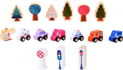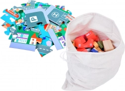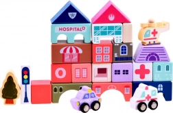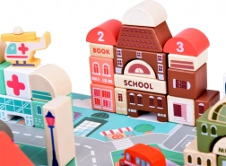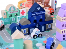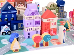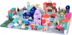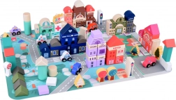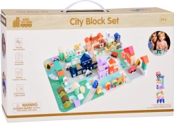 Ovaj pastelni set sadrži 115 raznolikih drvenih dijelova uključujući zgrade, vozila, stabla i prometne znakove. Djeca mogu izgraditi vlastiti grad sa školom, bolnicom, bankom i policijskom postajom. Uz ovu građevnu igračku razvijaju ne samo maštu, već i motoričke vještine.