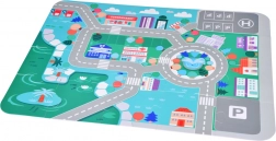 Podloga prikazuje gradsku panoramu s označenim cestama i parkiralištima, što djecu potiče na poučnu igru s vozilima.
