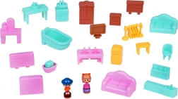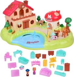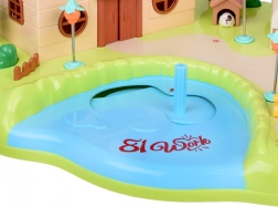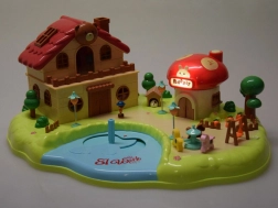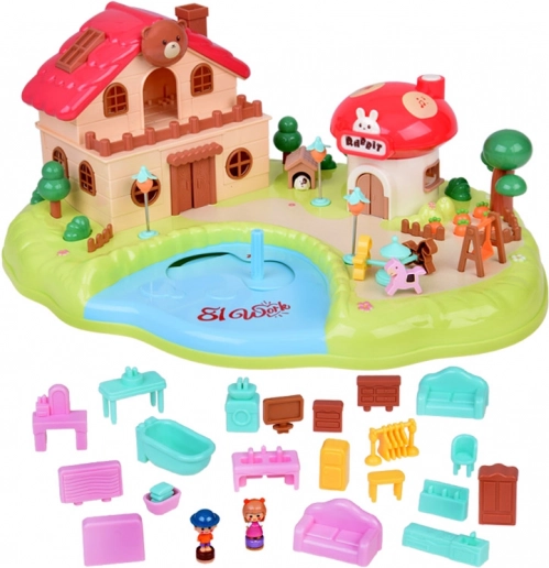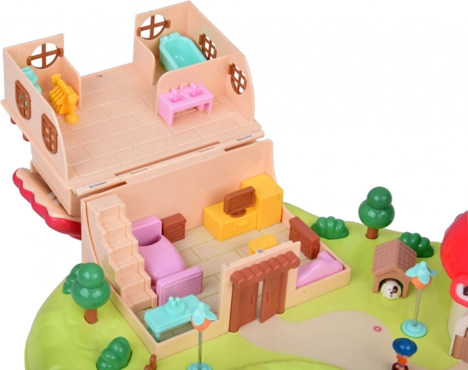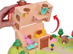 Spavaća soba s ormarom na otvaranje, kupaonica s kadom i perilicom, kuhinja s hladnjakom i soba s toaletnim stolićem. Vani čekaju igralište s vrtuljkom i ljuljačkom te trgovinica u obliku gljive.