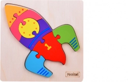 Djeca vježbaju hvat, preciznost i koncentraciju pri umećanju 7 dijelova u siluetu rakete na čvrstoj drvenoj ploči.