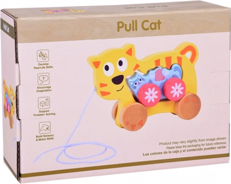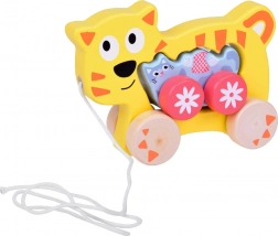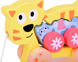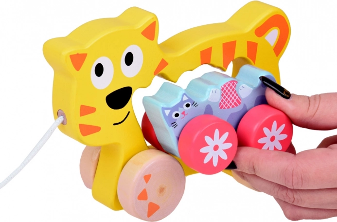 Ova drvena vučna mačja obitelj idealan je pratitelj za prve korake. Veća mačka ima otvor u tijelu za lako držanje, pričvršćenu uzicu i stabilne kotačiće. Manje mače vjerno slijedi, što djeci donosi radost kretanja i jača njihovu prirodnu znatiželju.