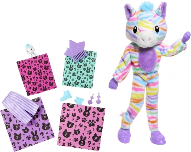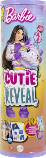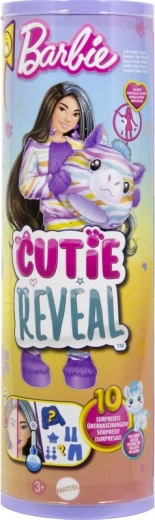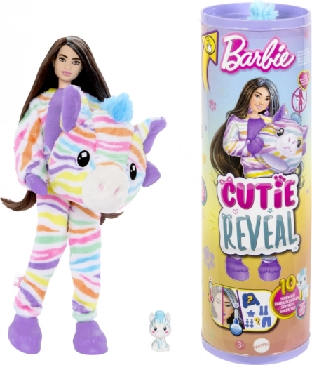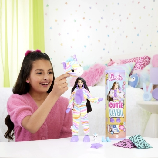 Otkrij svijet iznenađenja s lutkom BARBIE Cutie Reveal u kostimu duge zebre. Nakon skidanja mekog plišanog kostima pojavljuje se stilska lutka sa zabavnim dodacima, dvobojnom modnom jaknom i efektom promjene izgleda na vodu. U kompletu je i slatka mala životinjica te češalj–spužvica za magično otkrivanje boja.