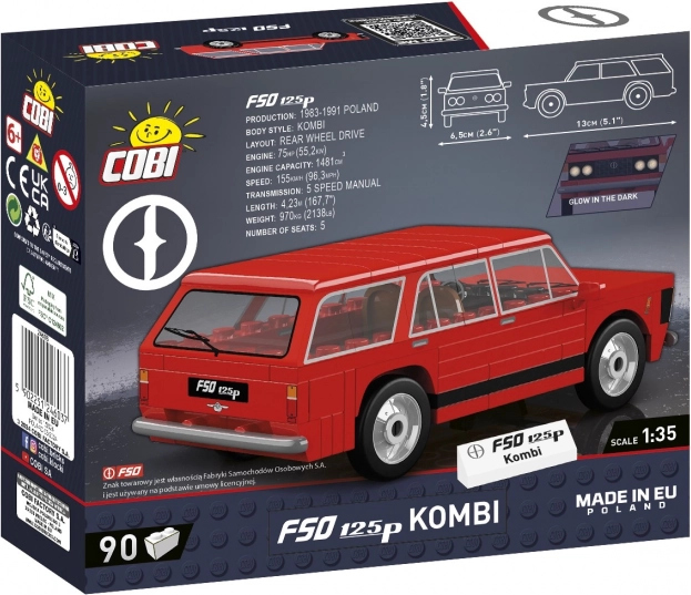 Licencirani model od kockica FSO 125p Kombi vjerno dočarava karakteristične linije legendarnog obiteljskog automobila, poznatog po prostranom prtljažniku i pouzdanosti. Mjerilo 1:35 nudi uravnotežen odnos detalja i veličine, pa je model prikladan i za izlaganje i za igru.