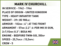Sastavite legendarni britanski teški pješački tenk MARK IV CHURCHILL u mjerilu 1:35 od 668 visokokvalitetnih dijelova COBI. Model nudi funkcionalne gusjenice, okretni toranj, pomični top i otvarajući poklopac. U kompletu su 2 detaljne figurice s bogatom opremom te visokokvalitetni otisci koji ne blijede. Idealan za ljubitelje povijesti i konstrukcijskih setova.