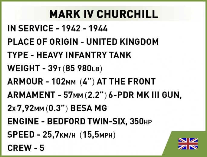 Ikonični tenk CHURCHILL spada među najpoznatija saveznička vozila Drugog svjetskog rata. Cijenjen je zbog jakog oklopa, niskog profila i izvrsne prohodnosti terenom. Ovaj set u mjerilu 1:35 vjerno dočarava detalje stvarnog vozila, uključujući povijesne oznake i uniforme posade zahvaljujući preciznim otiscima.