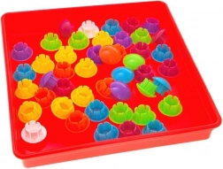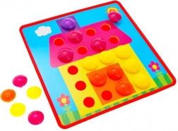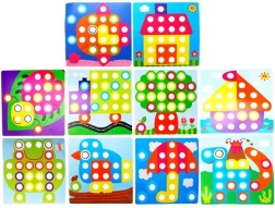 Set sadrži listove s otvorima u koje se klinčići umeću prema bojama. Idealno za učenje boja i strpljenja.