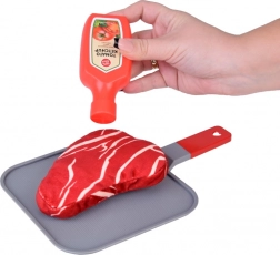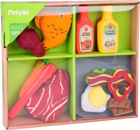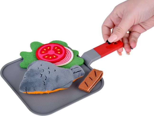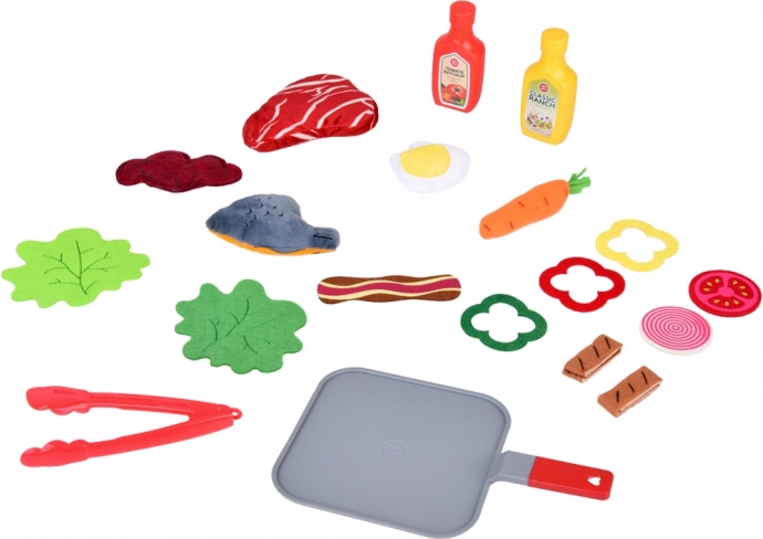 Otkrijte kreativnu igru u kuhinji s mekim kuhinjskim setom za djecu. Šarene tekstilne namirnice i plastični pribor potiču maštu, finu motoriku i učenje zdravih navika. U setu ćete pronaći tavu i kliješta, komade poput steaka, ribe, pilećeg fileta i trakica, kao i omiljena jaje, slaninu, povrće i umake – sve sigurno i ugodno na dodir.