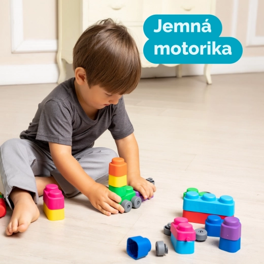 Svi blokovi izrađeni su od sigurnog i mekog materijala, što znači da se i najmanja djeca mogu igrati bez brige o svojoj sigurnosti. Idealno za djeca od 3 godine, pomaže razviti ključne vještine već u ranoj dobi. Složite sve što vam pada na pamet – od tornjeva preko robota do životinja i vozila.