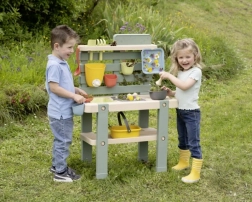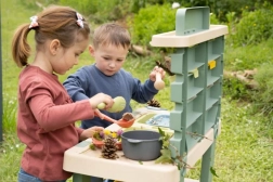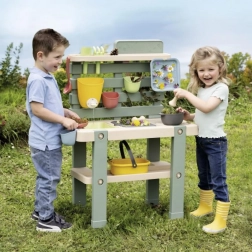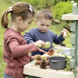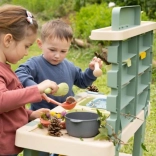 Ova izdržljiva vanjska kuhinjica u prirodnim bojama nudi djeci autentičan prostor za igru i eksperimentiranje s vodom, pijeskom i prirodnim materijalima. Izvadivi spremnici olakšavaju rukovanje i pospremanje, dok slavina s okretnim zatvaračem pomaže dozirati vodu i razvija finu motoriku.
