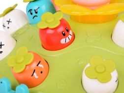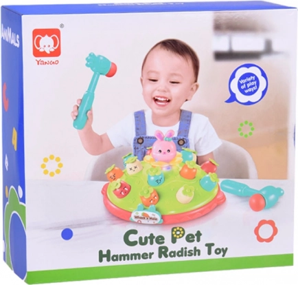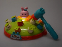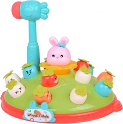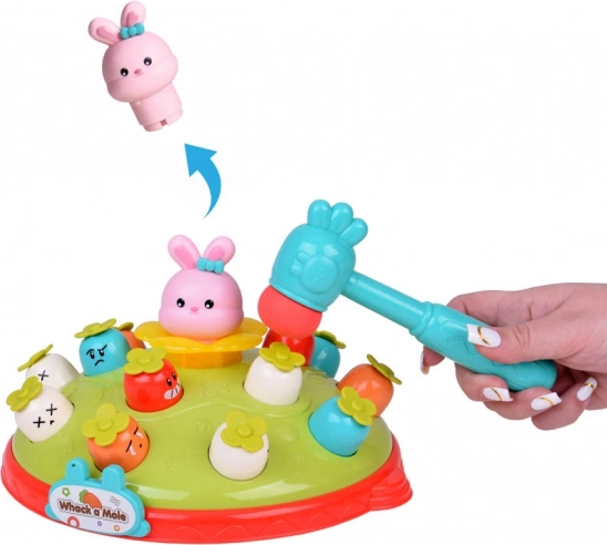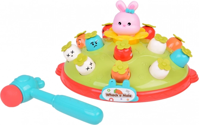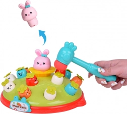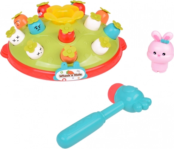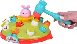 Igra Udari čekićem djeci nudi priliku za razvoj motoričkih vještina u zabavnom okruženju. Na šarenoj platformi koja podsjeća na livadu postavljene su mrkvice različitih boja i izraza, zajedno s ružičastim zečićem čija je zadaća iskočiti pri udarcu čekićem. Igru prati vesela melodija koja privlači dječju pažnju. Platforma ima dvije razine mrkvica i domišljat mehanizam koji, nakon okretanja zečića, uzrokuje da iskoči druga mrkvica s gornje razine.