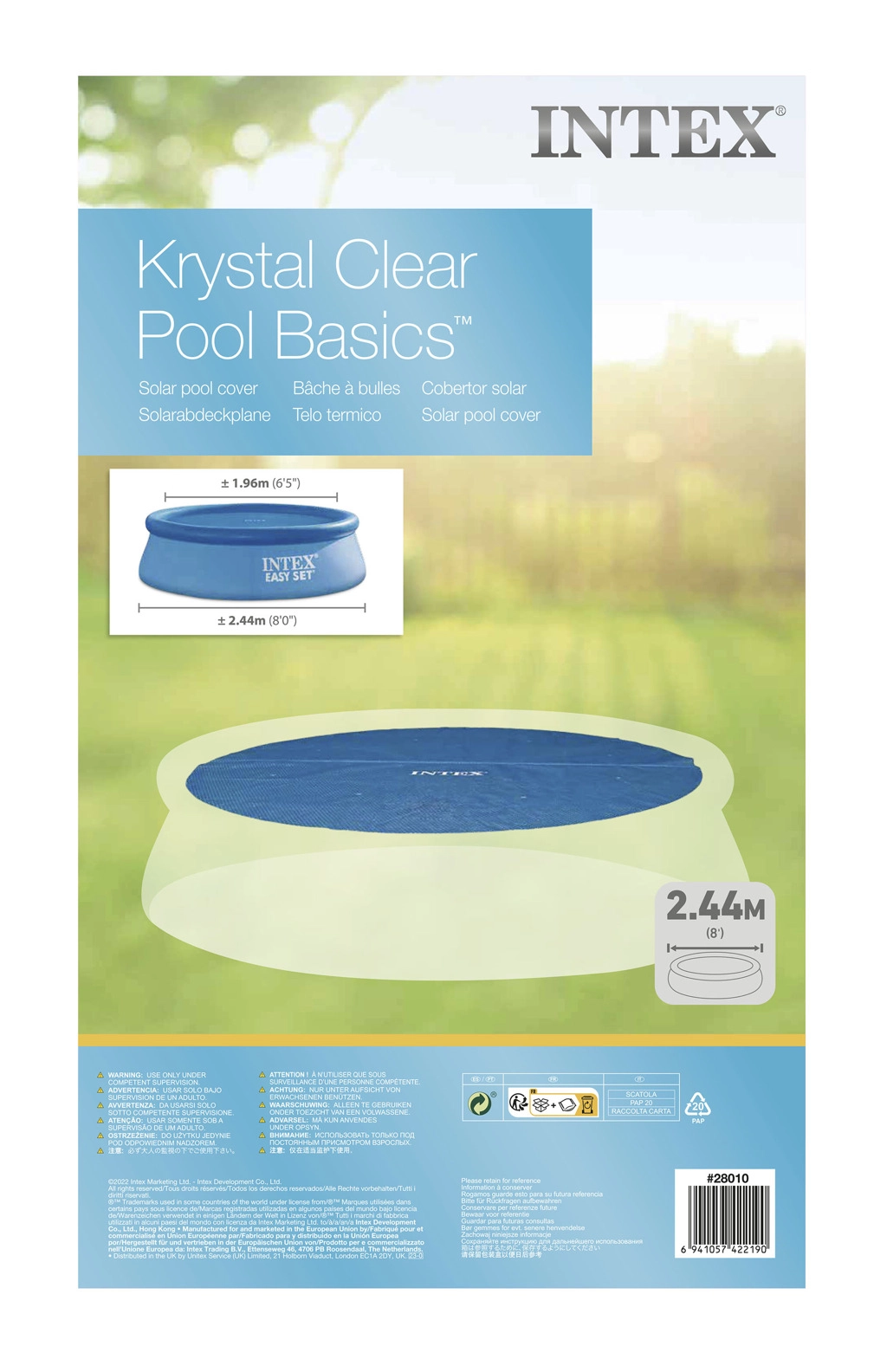 Praktična solarna pokrivna cerada INTEX za okrugle bazene promjera 244 cm pomaže zagrijavati i zadržavati temperaturu vode, smanjuje toplinske gubitke zahvaljujući izolacijskom sloju te istovremeno štiti površinu vode od nečistoća. Zahvaljujući mjehurićastoj strukturi učinkovito koristi sunčevu energiju i prikladna je za okvirne i samostojeće bazene.