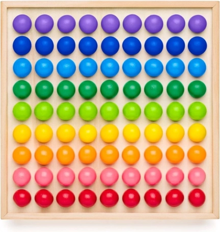 Ova drvena igra s kuglicama nudi bogate mogućnosti igre i učenja u jednom. Djeca slažu sličice prema predlošcima, slažu kuglice u male piramide te vježbaju finu motoriku i koordinaciju oko–ruka. Zahvaljujući preglednoj mreži i živim bojama lako usvajaju prepoznavanje boja, brojanje i uzoraka.