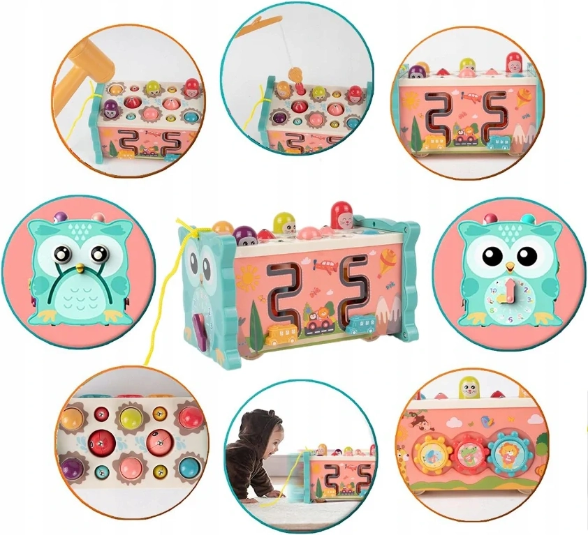 Motorička kocka 8u1 s motivom sove nudi svestrane mogućnosti za igru, učenje i otkrivanje. Pomaže razvijati finu motoriku, strpljenje i koncentraciju djeteta kroz osam različitih aktivnosti.