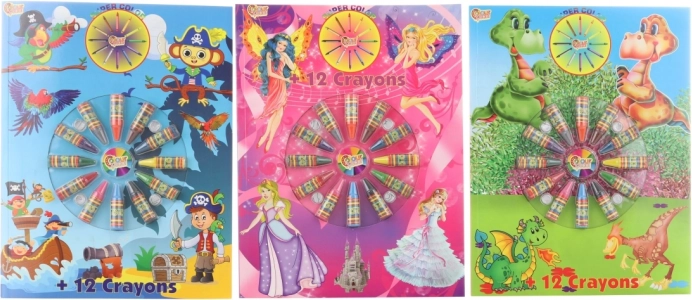 Otkrijte zabavan svijet s ovim bojankama u formatu A4 koje sadrže motive pirata, dinosaur(a) i princeza. Svaki paket uključuje 12 šarenih voštanih bojica, idealnih za djecu od 3 godine naviše.