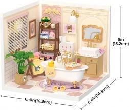 Stvorite vlastitu kupaonsku dioramu u nježnim pastelnim tonovima s kadom na nožicama, ogledalom, policama i mnoštvom minijaturnih dodataka. Zahvaljujući precizno izrezanim dijelovima od stabilnih materijala, model ćete lako sastaviti bez ljepila – a rezultat je čvrsta, prekrasno detaljna mini scena, idealna za policu ili kao poklon.