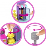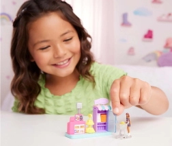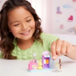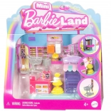 Mini lutka BARBIE (oko 3,5 cm) savija se u struku, može sjediti ili se nagnuti prema pultu i stoji na postolju u obliku srca koje pristaje drugim kućicama, vozilima i setovima serije MINI BARBIE LAND. Igra prirodno razvija maštu, finu motoriku i socijalne vještine.