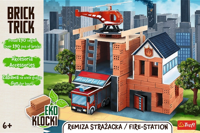 Sastavite vlastitu vatrogasnu postaju od pravih glinenih ciglica i drvenih letvica. Set BRICK TRICK nudi više od 190 ciglica, ponovno korištenje zahvaljujući ljepilu topivom u vodi te bogate ukrasne dodatke za realističan izgled. Odlično za razvoj manuelnih vještina, kreativnosti i koncentracije djece od 6 godina.