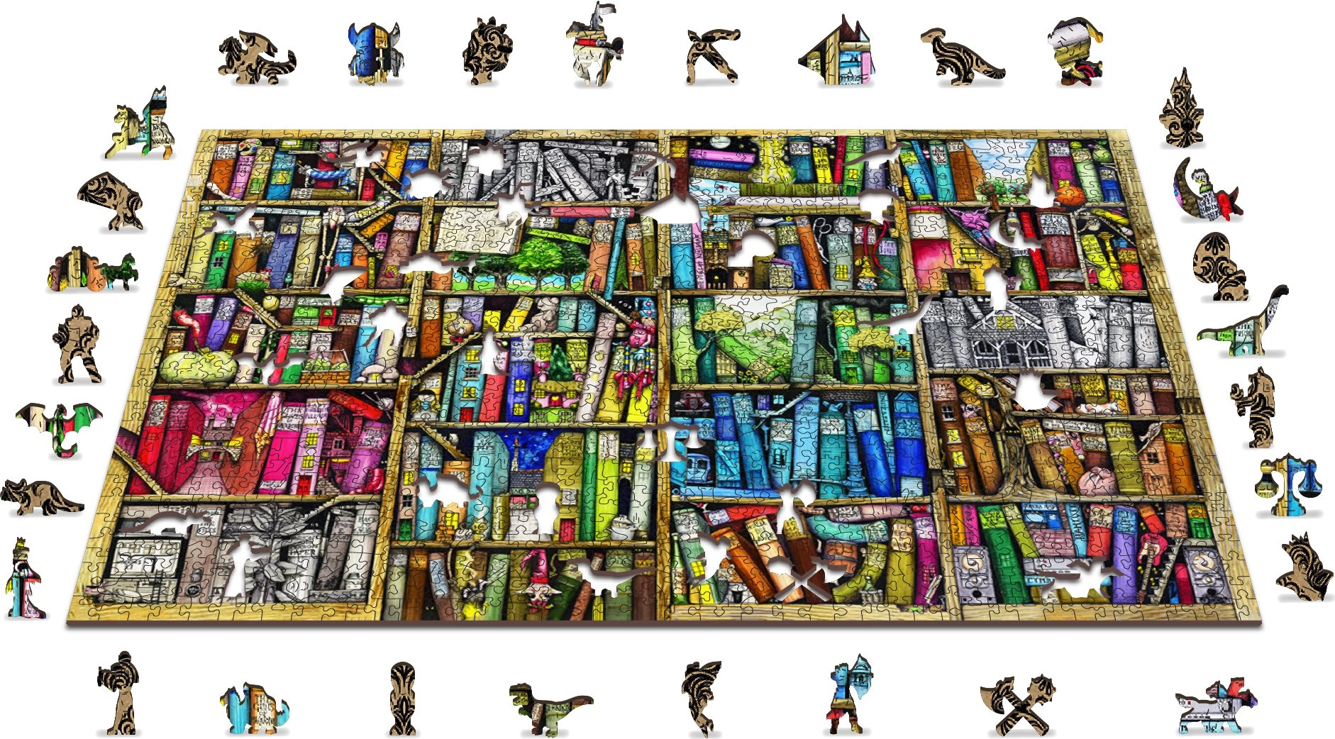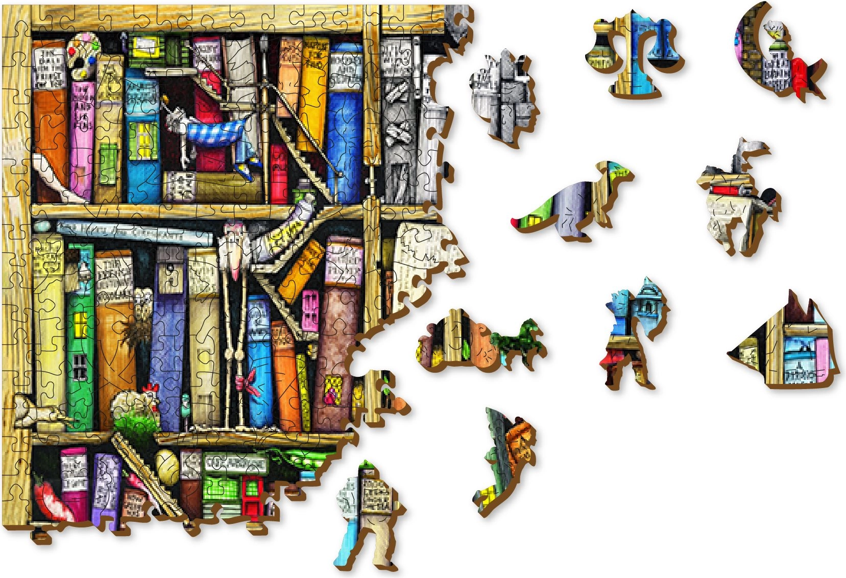 Isprobajte zabavne i izazovne puzzle WOODEN CITY s motivom polica s knjigama. Ove drvene puzzle laserski su izrezane i nude posebno oblikovane dijelove koji oduševljavaju originalnošću i precizno istaknutim detaljima.