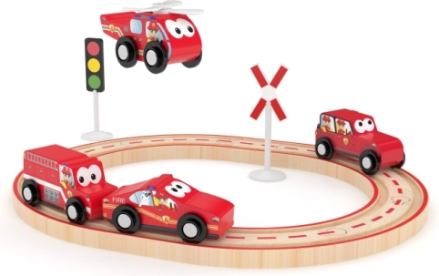 Dio pakiranja je 16 dijelova, uključujući drvene tračnice i vozila s vatrogasnim motivima. Djeca mogu graditi vlastite pruge i smišljati priče koje razvijaju njihovu maštu i socijalne vještine.