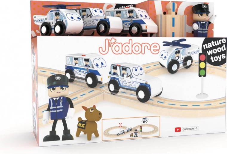 Otkrijte zabavan i edukativan set za najmlađe: drvena željeznička pruga s policijskom temom brenda J’adore. Set od ekološki održivog drva sadrži tračnice i 4 vozila u policijskom dizajnu, potiče maštu, finu motoriku i koordinaciju. Pogodno za djecu od 3 godine.