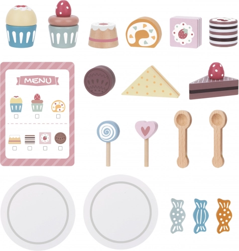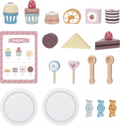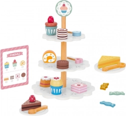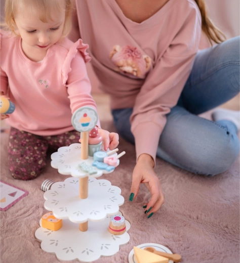 Ovaj elegantni drveni stalak u stilu slastičarnice nudi djeci realistčnu igru posluživanja. Zahvaljujući 3 razine mali slastičari imaju dovoljno mjesta za cupcakes, kolačiće i kekse, dok tanjurići i žličice pozivaju na zajednički “čajni party”.