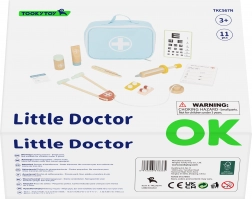 Sadrži 11 dijelova: platneni kofer, stetoskop, štrcaljku, toplomjer, “lijekove”, tubu s mašću, bočicu za lijekove, paket liječničkih kartica, tablicu za vid i liječničku značku. Zahvaljujući preglednom spremanju u kofer, set je idealan i za putovanja te se lako posprema.