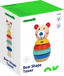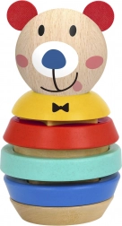 Drvena piramida s medvjedićem spaja igru i učenje. Šareni kolutovi, zvjezdice i drugi oblici slažu se na štap i na odgovarajuća mjesta, što potiče logičko razmišljanje i prostornu maštu. Djeca kroz igru usvajaju razvrstavanje prema obliku, boji i veličini.