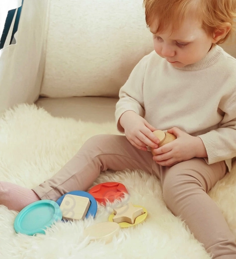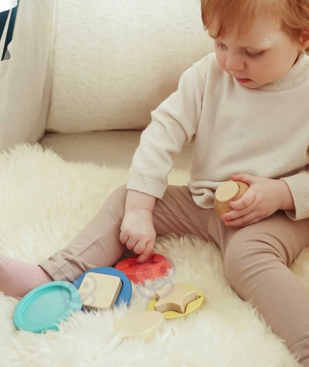 Šareni kolutovi i oblici potiču djecu od 12 mjeseci na slaganje i razvrstavanje, čime razvijaju finu motoriku i koordinaciju oko–ruka.