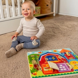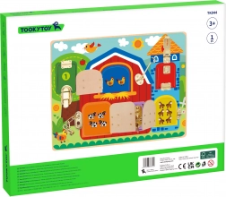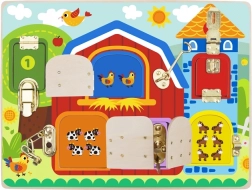 Otkrijte zabavnu i edukativnu igračku za djecu od 3 godine: drvenu manipulativnu ploču s motivom farme od Tooky Toy. Šest šarenih vratanca s različitim ključanicama, zasunima i lancima razvija finu motoriku, logičko razmišljanje i koordnaciju oko–ruka, dok ispod vratanca čekaju slike životinjica kao ugodno iznenađenje.
