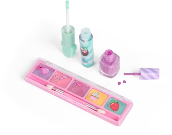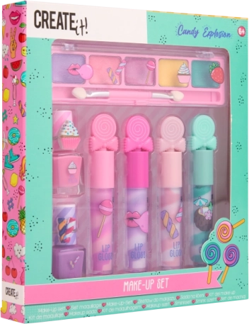 Otkrijte razigrani dječji set šminke Candy CREATE IT! – šareni komplet s sjenilima za oči, sjajilima za usne i lakovima za nokte u preslatkom, slatkićima nadahnutom dizajnu. Idealan za kreativnu igru i prve sigurne kozmetičke pokuse za djecu od 6 godina.