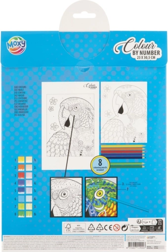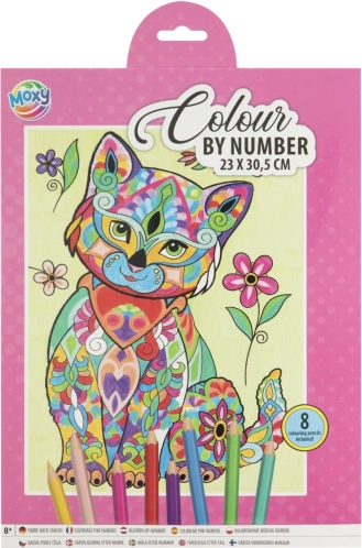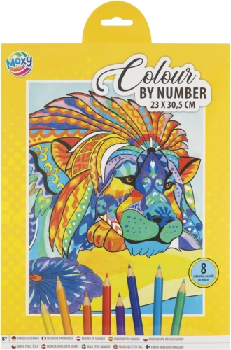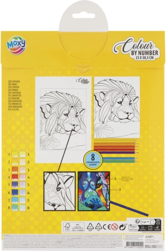 Ovaj kreativni set donosi jednostavan i zabavan način da kod kuće izradiš dojmljivu sliku veličanstvenog lava. Na predlošku su površine označene brojevima; svakom broju pridružuješ boju iz priloženih 8 bojica i korak po korak ispunjavaš detaljnu sliku veličine 23 × 30,5 cm.