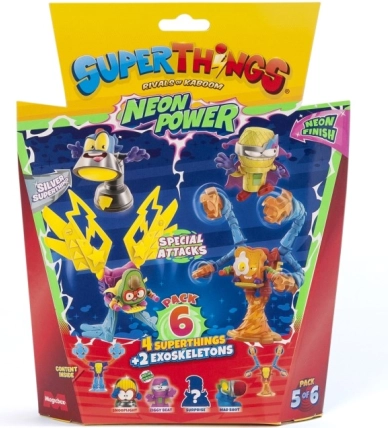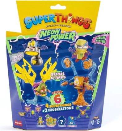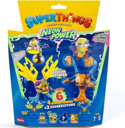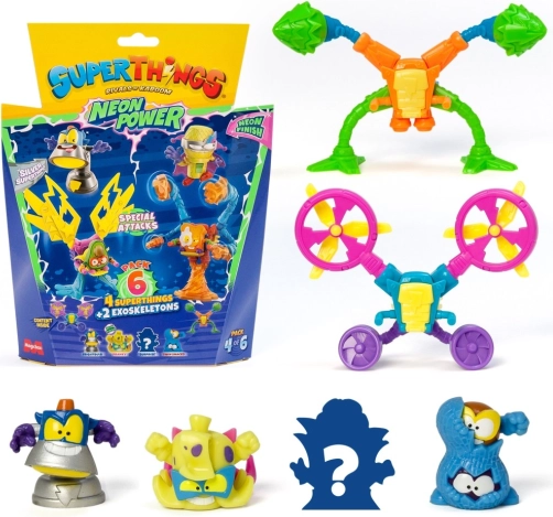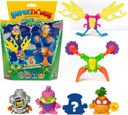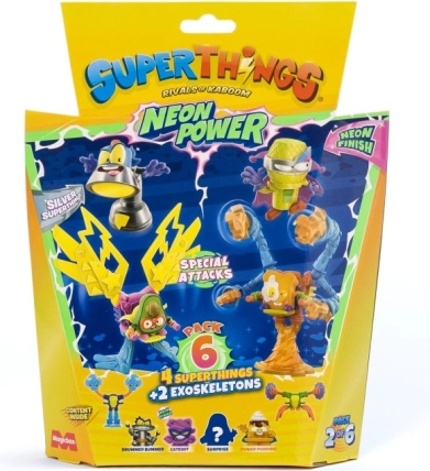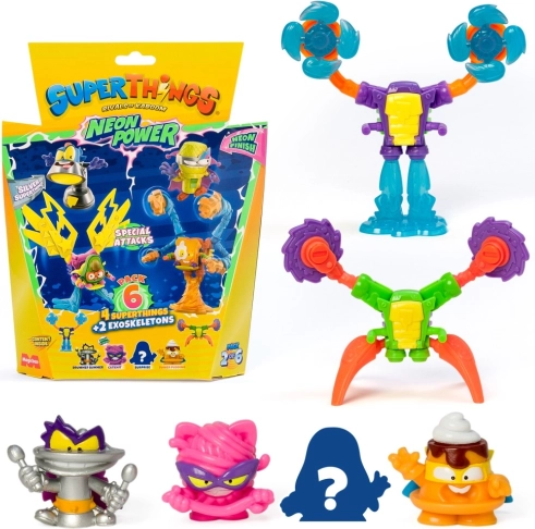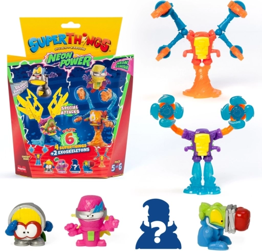Uđite u grad Kaboom i proširite svoju kolekciju sa SuperThings: Neon Power! Svako pakiranje donosi kombinaciju 4 herojske (ili zlikovačke) figurice i 2 egzoskeleta koji vašim bitkama daju snagu i stil. Neonski dizajn osigurava da se vaši likovi istaknu u svakoj akciji.