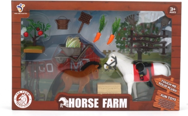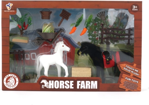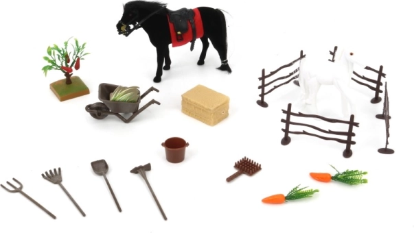 Set sadrži sve potrebno za izradu vlastite konjske farme, uključujući figurice konja, seoske alate i povrće.