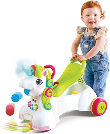 Otkrijte svestranu guralicu i hodalicu 3u1 – jednorog, koja podupire prve korake, razvoj motorike i zabavno učenje. Dijete počinje s centrom za igru (cca 6M+), nastavlja gurati za rukohvat (cca 12M+) i kasnije prelazi na vožnju u sjedećem položaju (cca 16M+). Šarena griva s različitim teksturama stimulira osjete, a osvijetljene tipke podučavaju boje, oblike i brojeve.