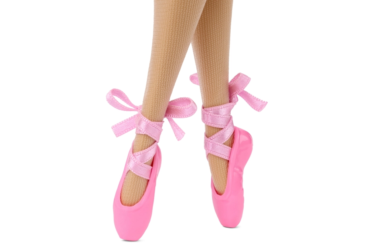 Ružičaste baletne cipelice s efektnim vrpcama odlično stoje na nozi lutke i zaokružuju baletni look do posljednjeg detalja.