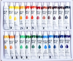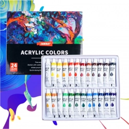 Kompletan set akrilnih boja za hobi i atelje: 24 intenzivne nijanse u praktičnim tubama od 12 ml. Boje su bogato pigmentirane, brzosušeće i odlično prianjaju na razne podloge – od papira i platna do drveta, stakla i metala. Idealan za početnike i profesionalce, s tubama sa navojnim čepom protiv isušivanja.