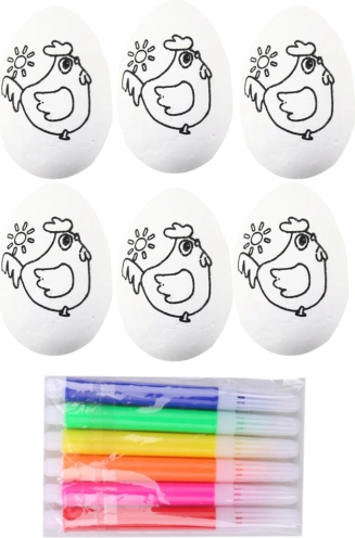 - Sve u pakiranju – 6 jaja + 6 šarenih flomastera (žuta, narančasta, crvena, plava, ružičasta, zelena).