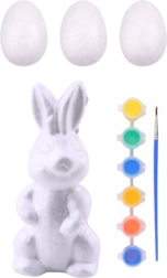 Uskrsni set s polistirenskim jajima i zecom idealan je izbor za kreativno slikanje s djecom. Sadrži 3 polistirenska jaja i figuru zeca zajedno sa 6 boja za slikanje, koje omogućuju neograničenu kreativnost.