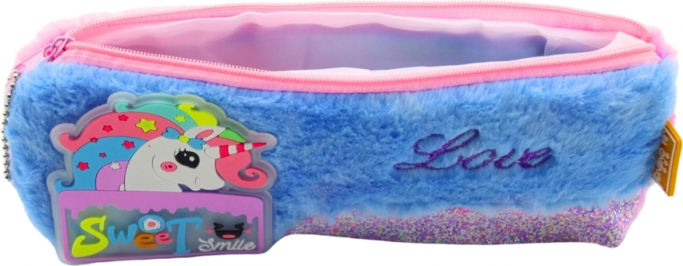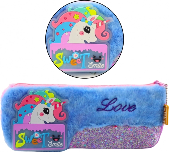 Ova čarobna plišana pernica u plavoj boji s motivom jednoroga i sjajnim elementima izvrsna je opcija za sve školske potrepštine.
