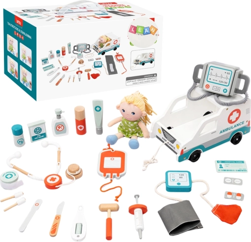 Omogućite djeci da postanu heroji s realističnim spasilačkim setom. Ova drvena igračka sadrži medicinsku opremu poput defibrilatora, tlakomjera, stetoskopa i vozila hitne pomoći, što igri daje višu razinu realizma.