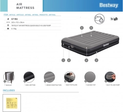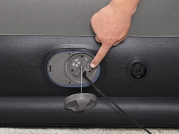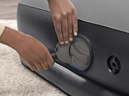 Ugrađena USB pumpa napuni ležaj za 5–6 minuta i kompatibilna je s AC/DC adapterima i powerbankama – idealno kada ste na putu. Integrirani jastuk i ugodna, rebrasta površina povećavaju udobnost pri spavanju; dimenzije 152 × 203 cm udobno primaju dvije odrasle osobe.